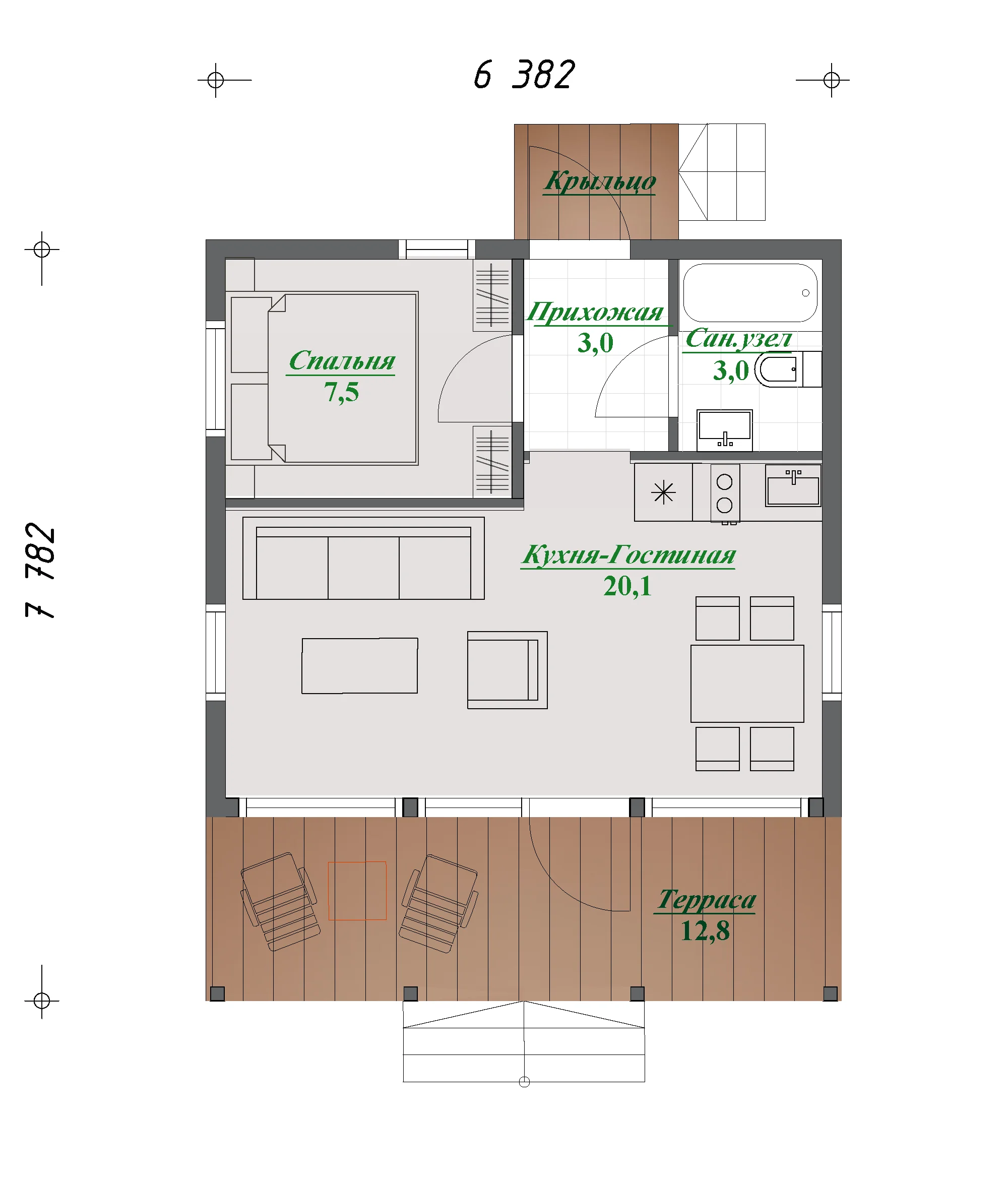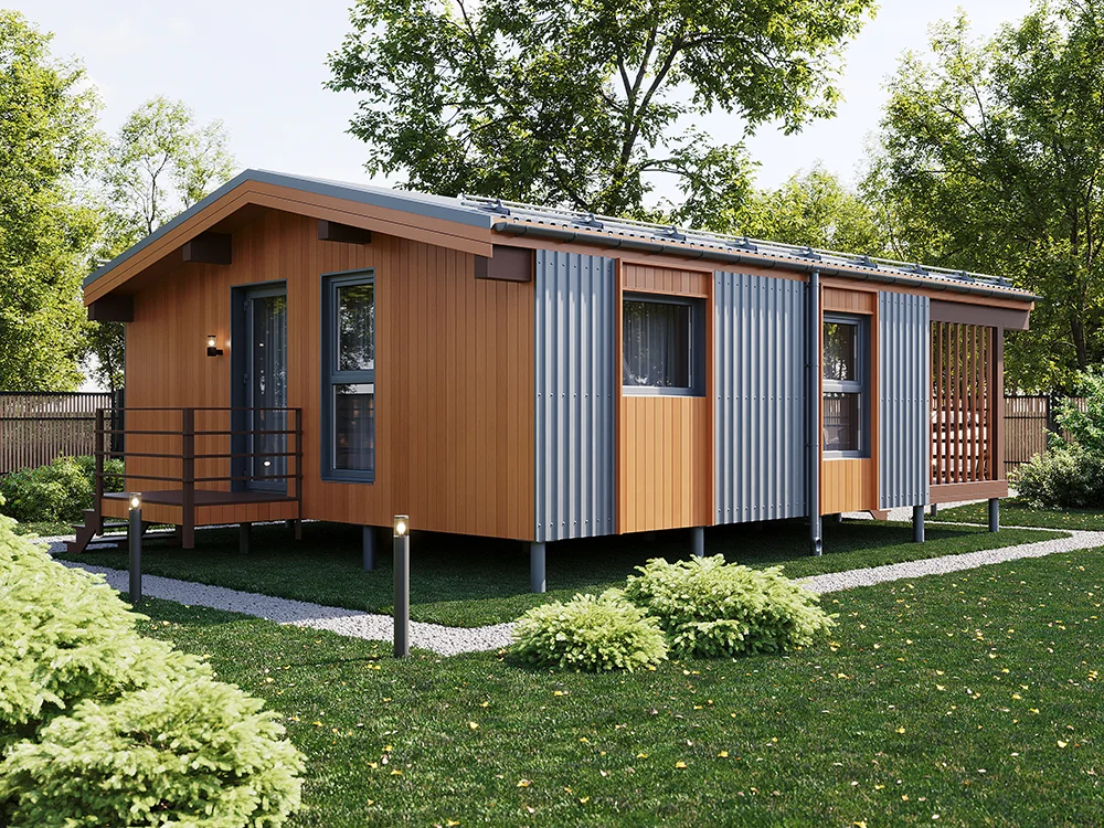 Одноэтажный жилой дом для круглогодичного проживания. Просторная кухня-гостиная. Панорамное остекление, отдельный выход на террасу, где можно организовать зону барбекю или обеденную зону. Небольшая спальня на 2 человек. Дополнительные спальные места можно предусмотреть в гостиной (раскладной диван). Внутренние инженерные сети, оборудованный санузел. Основной вход в дом в задней части через прихожую.