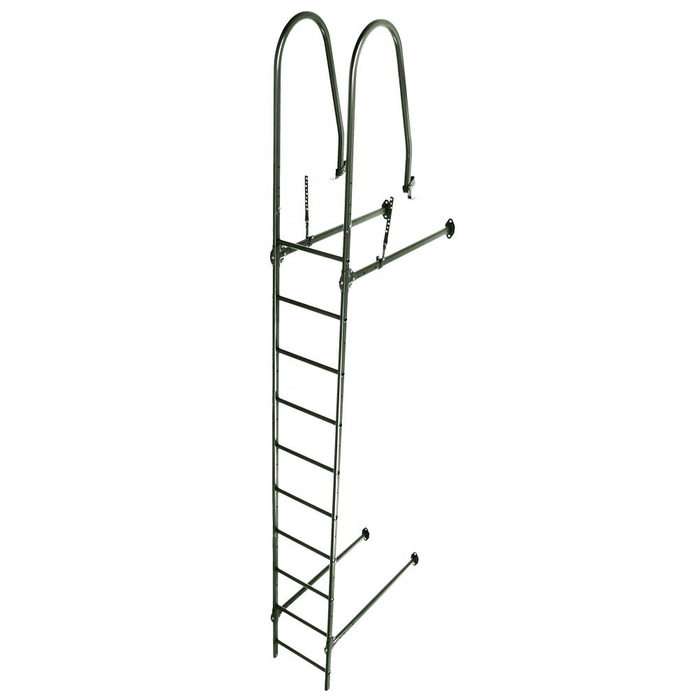 Стеновая лестница крепится с помощью стеновых кронштейнов к фасаду здания, дуговыми поручнями к обрешетке кровли и дополнительно фиксируется к карнизу соответствующими кронштейнами.