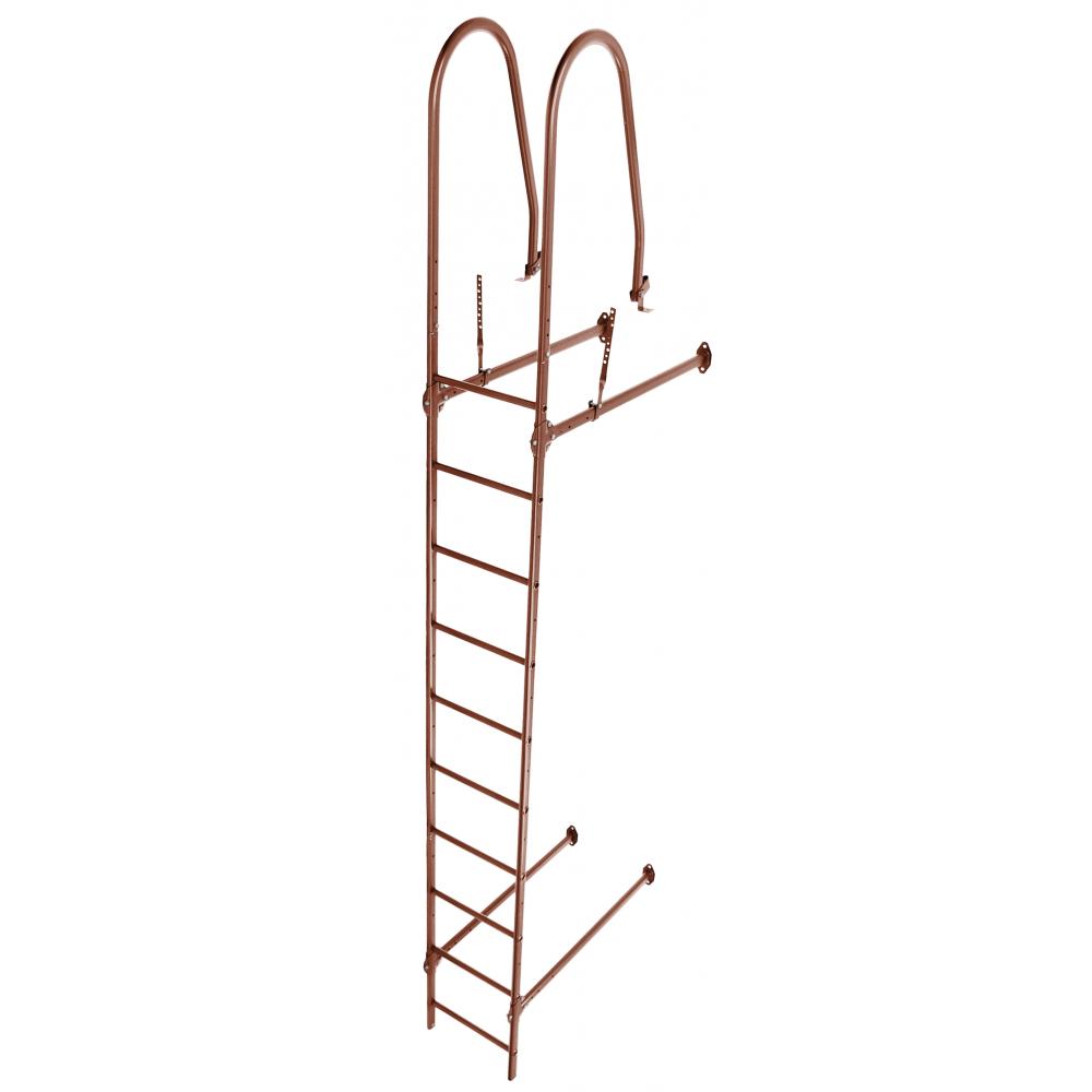 Стеновая лестница крепится с помощью стеновых кронштейнов к фасаду здания, дуговыми поручнями к обрешетке кровли и дополнительно фиксируется к карнизу соответствующими кронштейнами.
