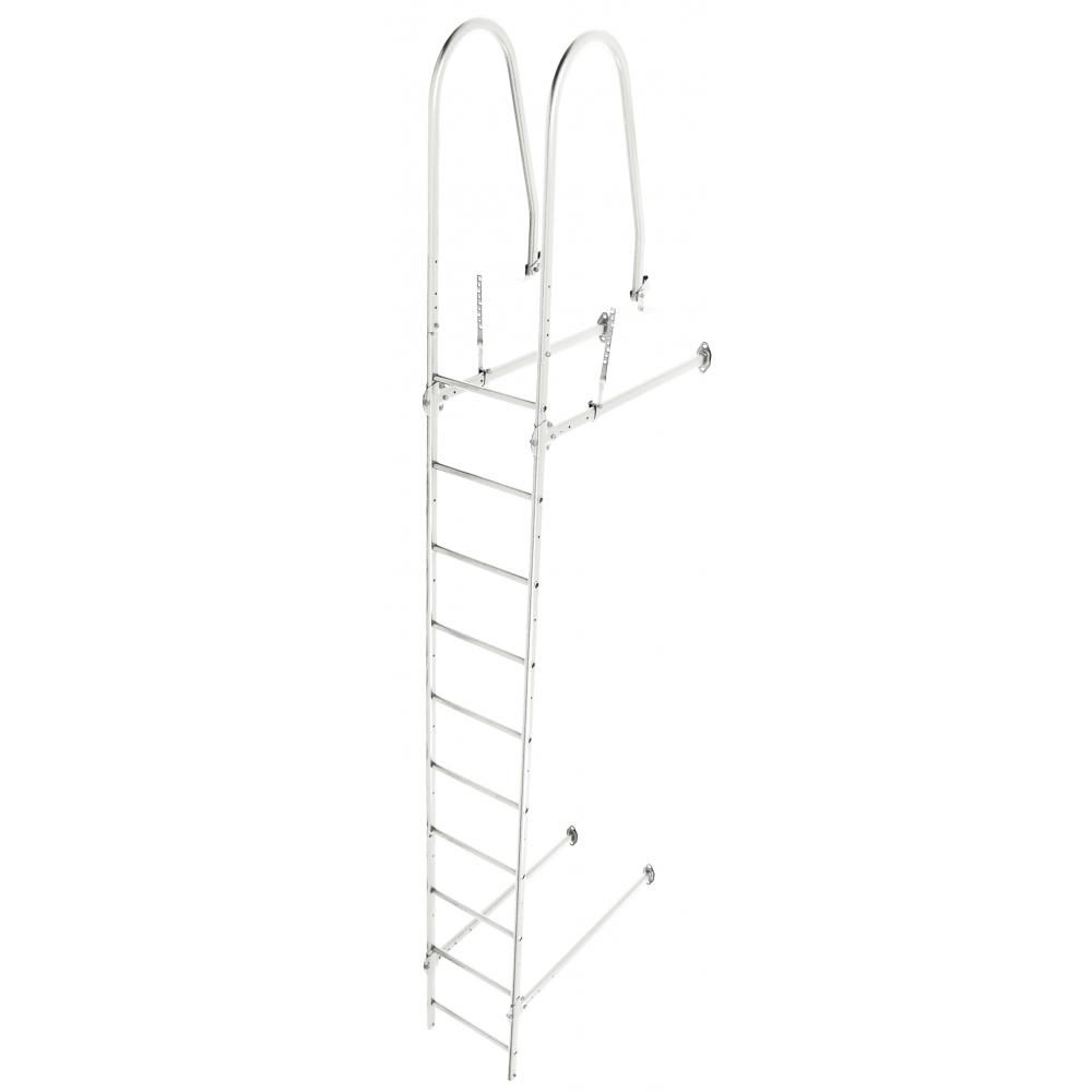 Стеновая лестница крепится с помощью стеновых кронштейнов к фасаду здания, дуговыми поручнями к обрешетке кровли и дополнительно фиксируется к карнизу соответствующими кронштейнами.
