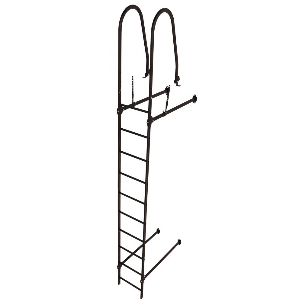 Стеновая лестница крепится с помощью стеновых кронштейнов к фасаду здания, дуговыми поручнями к обрешетке кровли и дополнительно фиксируется к карнизу соответствующими кронштейнами.